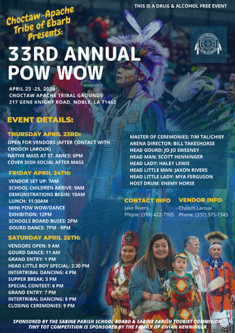 The Choctaw-Apache Tribe of Ebarb invites the community to gather for the 2026 Annual Pow Wow, a celebration of culture, tradition, and living Indigenous presence. This year’s Pow Wow will feature intertribal dancing, drum groups, Native artisans and vendors, and shared food and fellowship. The event is open to the public and offers an opportunity to honor our ancestors, support Native artists, and celebrate the strength and continuity of Choctaw-Apache culture today.